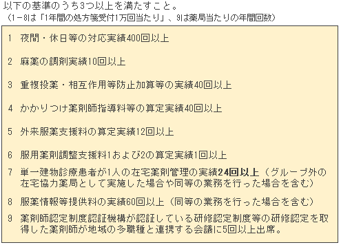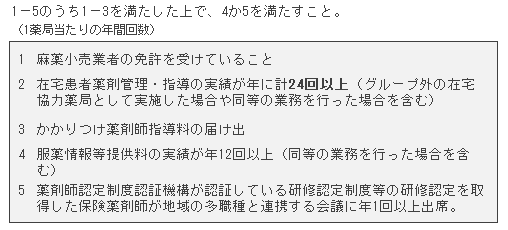 さらに、「多職種連携会議への参加」を除く8項目では、これまでの常勤薬剤師の人数当たりではなく「1年間の処方箋受付1万回当たり」の実績を求めます。処方箋の受け付けが多いほど基準が高くなるので大病院の門前薬局などには不利かもしれません。