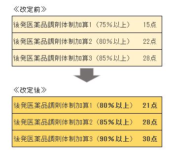 後発医薬品調剤体制加算は、後発薬の調剤割合(数量ベース)に応じて3段階で評価しています。現在は、最低ラインの75%をクリアすると点数が低い後発医薬品調剤体制加算1を算定できますが、見直し後は加算1の基準を「80%以上」に引き上げ、6点増の21点にします。