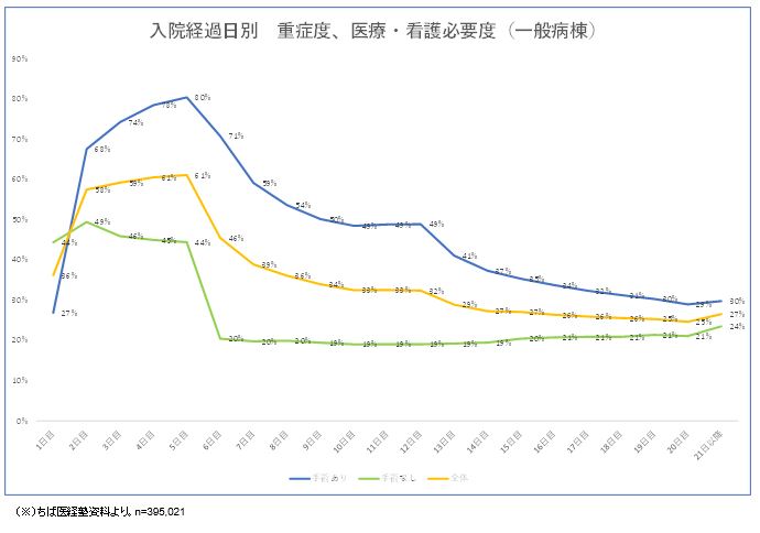 連載第143回のように、サンプル病院を入れ替えてもこの傾向が変わることはない。グラフ1は、横軸に入院からの経過日数を取っており、縦軸は経過日別の一般病棟の看護必要度IIで評価した結果である。手術あり患者の評価は極めて高いのに対して、手術なしは厳しい。手術なし患者の最初の5日間が40%以上と高いのは、救急医療管理加算が5日まで評価されていることと整合する。