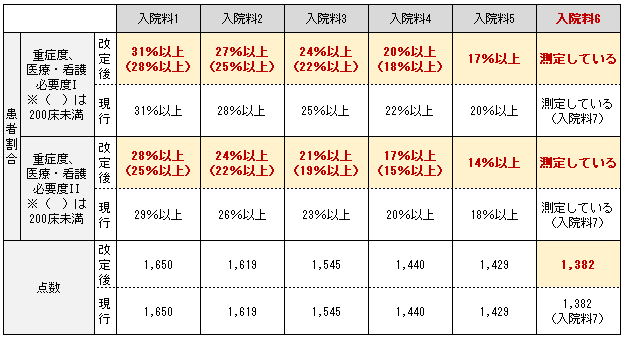 急性期一般入院料は、7つのうち現在の入院料6を廃止し、入院料7を新たな「急性期一般入院料6」に繰り上げ、6つに再編する。新たな急性期一般入院料6は、入院料7の1,382点を維持する。ただ、3月31日時点で急性期一般入院料6を届け出ている病棟は9月30日まで見直し前の点数を算定できる。