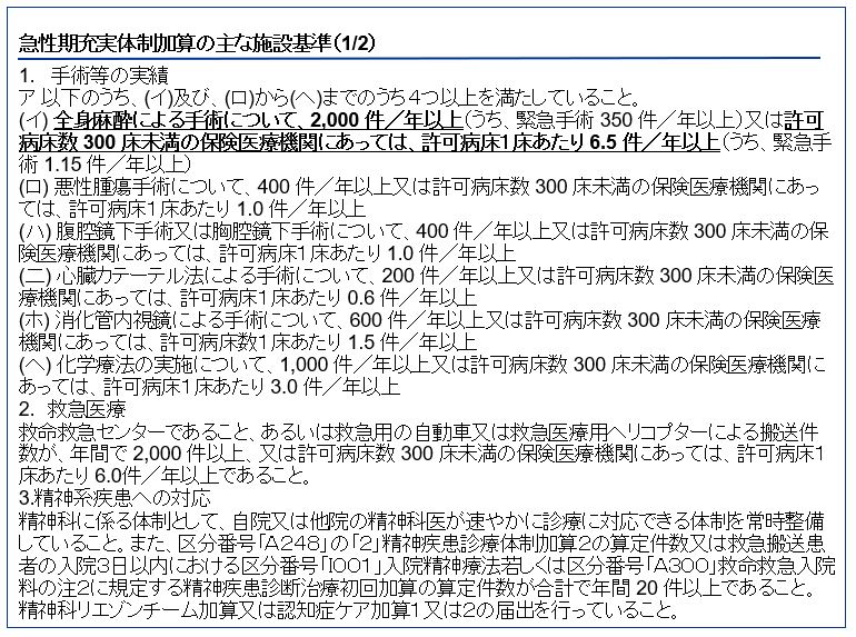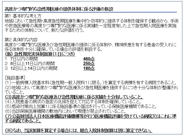 2022年度診療報酬改定において、高度かつ専門的な急性期医療を提供する体制の評価として「急性期充実体制加算」が新設される。当該加算は7日以内について1日当たり460点など極めて高い評価が行われ、今回改定の目玉である=資料1=。従来の総合入院体制加算よりも相当程度高い報酬の設定となっており、極めて高いハードルが設定されるであろうことを私としては予想していた。