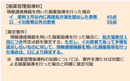 薬機法や局長通知などに基づきオンライン服薬指導を外来の患者さんに行った場合、薬局は4月以降、服薬管理指導料4を算定することになりました。点数は、対面の服薬指導と同じに設定され、原則3カ月以内に再度処方箋を出した患者さんは1回45点、それ以外が1回59点=図1=。