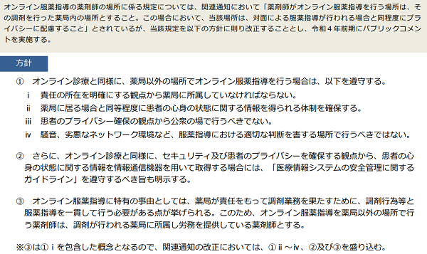 薬局の薬剤師がオンライン服薬指導を行う場所は「調剤を行った薬局内」と規定されていますが、それを見直して薬局以外でも実施できるようにしようというのです。厚生労働省は、そうした方針を容認し、局長通知の見直し案を2022年の「前期」にまとめ、それへのパブリックコメントをまた行うことにしています。