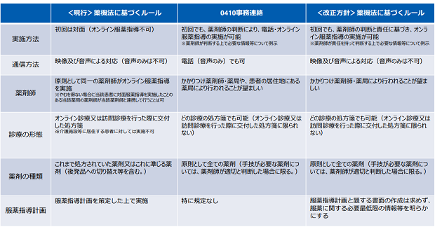 表1 オンライン服薬指導の薬機法に基づくルールと「0410対応」の比較