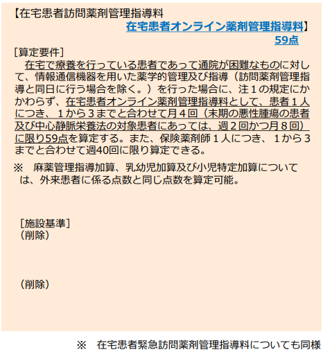 在宅患者オンライン服薬指導料は患者さん一人につき月1回しか算定できませんでしたが、見直し後の在宅患者オンライン薬剤管理指導料は対面指導の分を含め、原則として月4回まで算定できるようになりました。