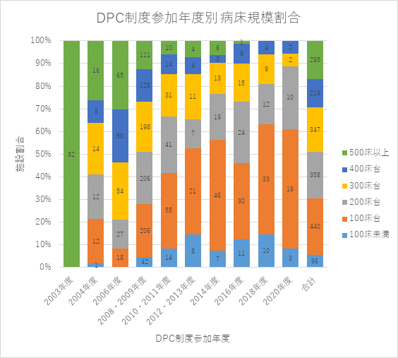 グラフ1 DPC制度参加年度別 病床規模割合推移
