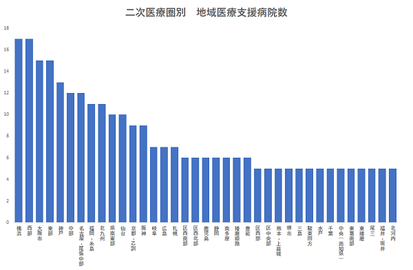 グラフ1は都道府県別の地域医療支援病院数であり、地域差が著しい。さらに二次医療圏別の承認病院数トップ30がグラフ2であり、かなり充足する地域もある。一方で二次医療圏に1つ以上とし、紹介中心の中核病院を決めることを目的とする当該制度ではあるが、それを満たせない医療圏が多数あるのも現実である。