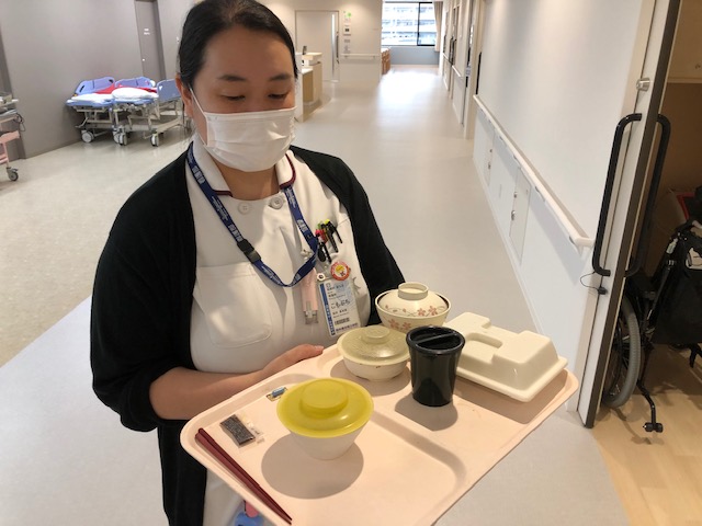 入院患者に提供する食事は、施設地下にある調理場で調理する。関連会社を活用するものの直営方式で入院患者に食事を提供している。「さまざまな患者さんが入院し、その都度体調などに応じた食事を提供するため、直営の方が自由度は高く、食材ロスも減らせる」(芦原事務長)。