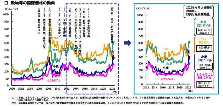 農林水産省によると、食用油の原材料となる大豆やトウモロコシなど穀物の国際価格は20年後半から南米の乾燥、中国の輸入需要の増加、21年の北米の北部の高温乾燥などにより上昇した=図1=。鑓水部会長の言う“20年ごろ”と一致する。