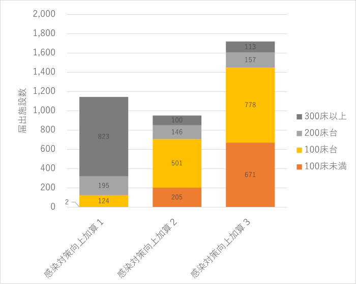 感染対策向上加算は、大病院は加算1を、中小病院でも加算2・加算3をある程度届け出ている=グラフ1=。