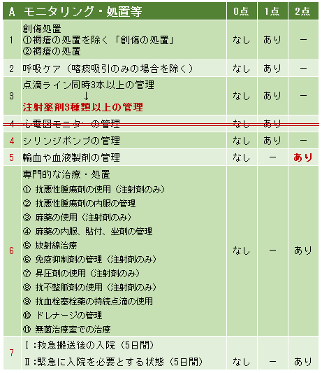 同じA項目の「点滴ライン同時3本以上の管理」が「注射薬剤3種類以上の管理」に置き換わりました=表=。これで拾われるケースもあるでしょう。