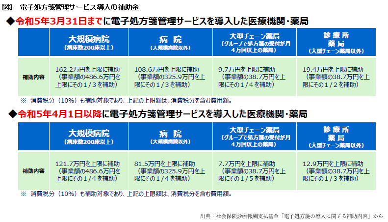 ただし、早期導入を促すため、23年3月31日までに導入した場合には、特例補助を設定しました。補助率と上限額を上積みし、▽大病院は補助率3分の1で上限162.2万円▽その他の病院は3分の1で上限108.6万円▽大型チェーン薬局は4分の1で上限9.7万円▽診療所とその他の薬局は2分の1で上限19.4万円-です。