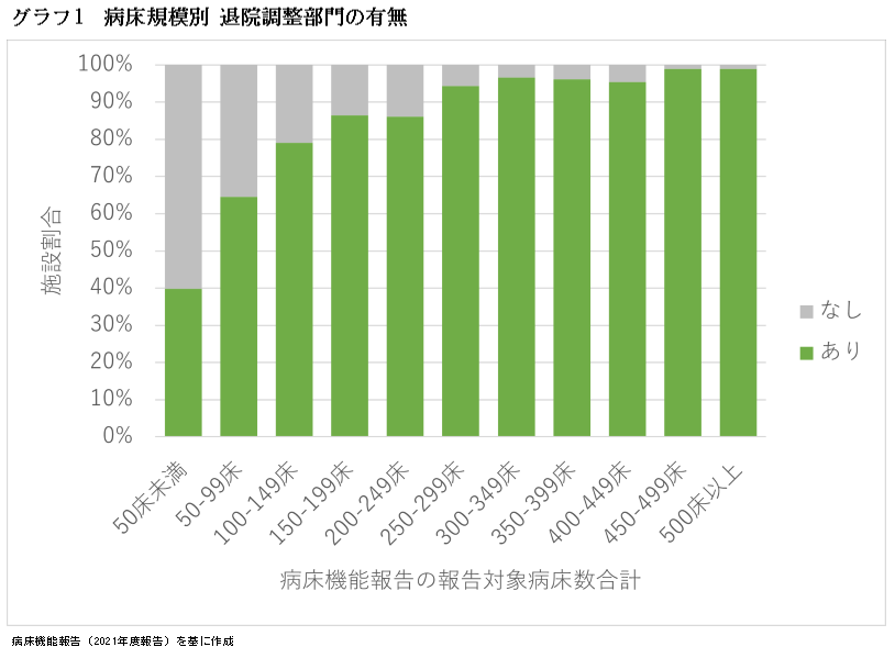 現状、病院の多くが退院調整部門を持っている=グラフ1=。2018年度診療報酬改定で、退院支援加算が入退院支援加算と名称を変え、入院前からの介入を評価するようになった。そのため、業務範囲も退院調整だけでなく入院調整・ベッドコントロールまでを対象としている病院も増えている印象が強い。