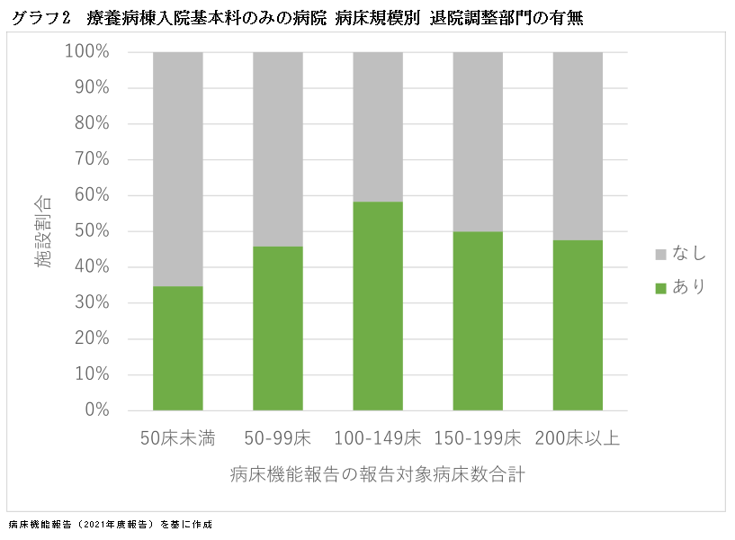 ただし、病床機能報告上、報告対象の病棟が療養病棟入院基本料のみの病院でその状況を見ると、退院調整部門を持っている割合は低下する=グラフ2=。