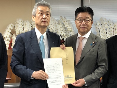 加藤厚労相(右)に要望書を手渡す日医の松本会長(19日、厚労省)