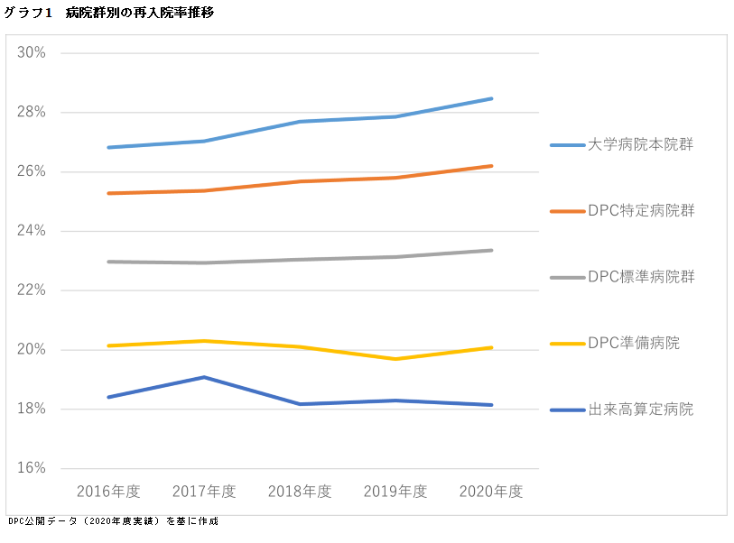 DPC算定病院において再入院率の上昇が続いている=グラフ1=。再入院率の上昇は、病床の高回転化や入院患者の高齢化、化学療法患者の増加などさまざまな要因が考えられる。