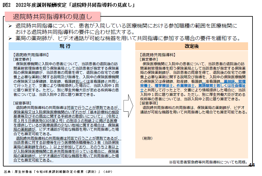 22年度の調剤報酬改定では、薬局の退院時共同指導料の算定要件の見直しが行われ、患者が入院している医療機関側の共同指導への参加職種に薬剤師が加えられました。医療機関の退院時共同指導料の要件では、すでに参加職種に薬剤師も位置付けられており、それに合わせて薬局側の要件を拡大したのです。