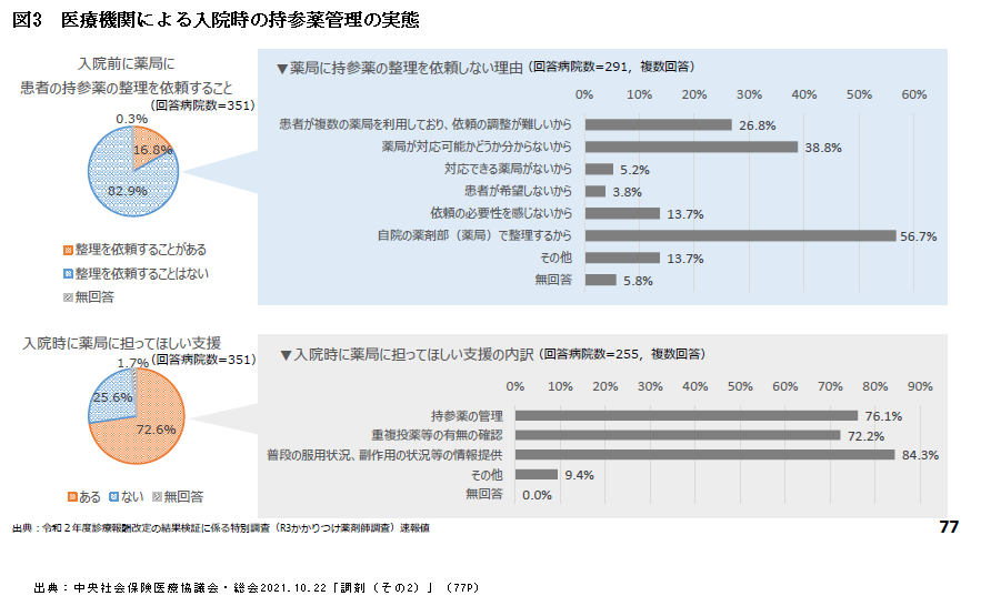 一方、医療機関の73%が、入院時に薬局に担ってほしい支援があるとの調査結果があります。中医協・診療報酬改定結果検証部会が20年度改定後に実施した調査で、具体的には、▽普段の服用状況、副作用の状況などの情報提供(84%)▽持参薬の整理(76%)▽重複投薬などの有無の確認(72%)-となっています。