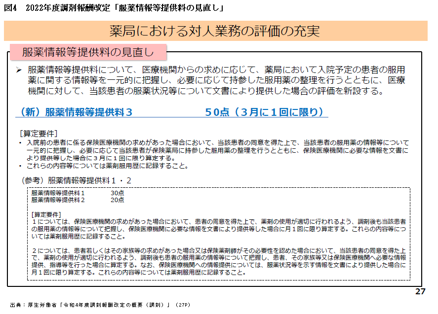 服薬情報等提供料1(30点)が医療機関からの求めに対応するもので、22年度改定以前は入院予定患者に関する場合も含まれていました。