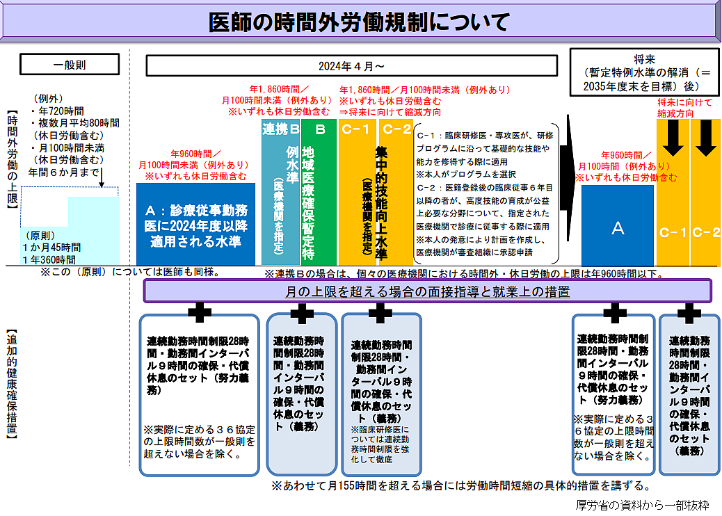 医師の時間外・休日労働時間は2024年4月以降、副業や兼業を含め、原則として年960時間に罰則付きで規制される。ただ、救急医療など緊急性の高い業務に従事する医師らに配慮し、年1,860時間に期限付きで上限を緩和する「B水準」などの特例を設ける。