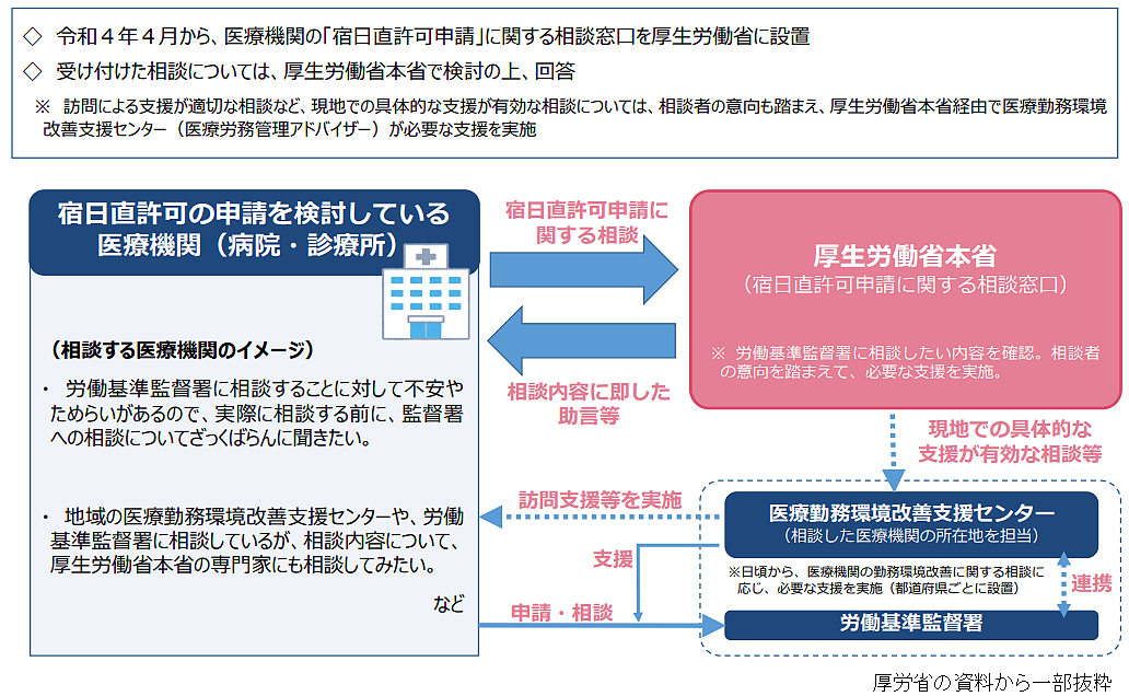 宿日直許可に関する相談には、基本的に申請先の労基署が対応することになるが、平野さんは、「いきなり労基署へ相談するのはハードルが高いなら、都道府県の医療勤務環境改善支援センターに気軽に相談してほしい」と話している。厚労省の相談窓口を活用するという方法もある。