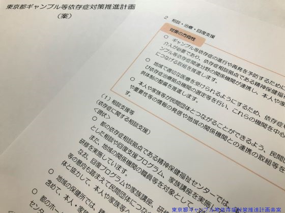 東京都は9日、「東京都ギャンブル等依存症対策推進計画」(2022-24年度)の素案を公表した。都内の医療機関に対し、依存症対策全国センターで実施している「ギャンブル等依存症治療指導者養成研修」の受講を促す。【新井哉】