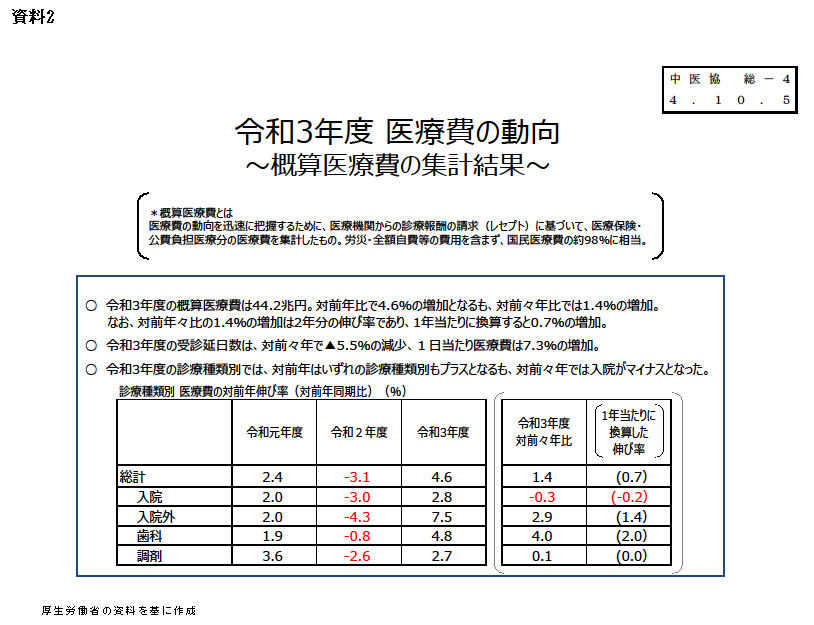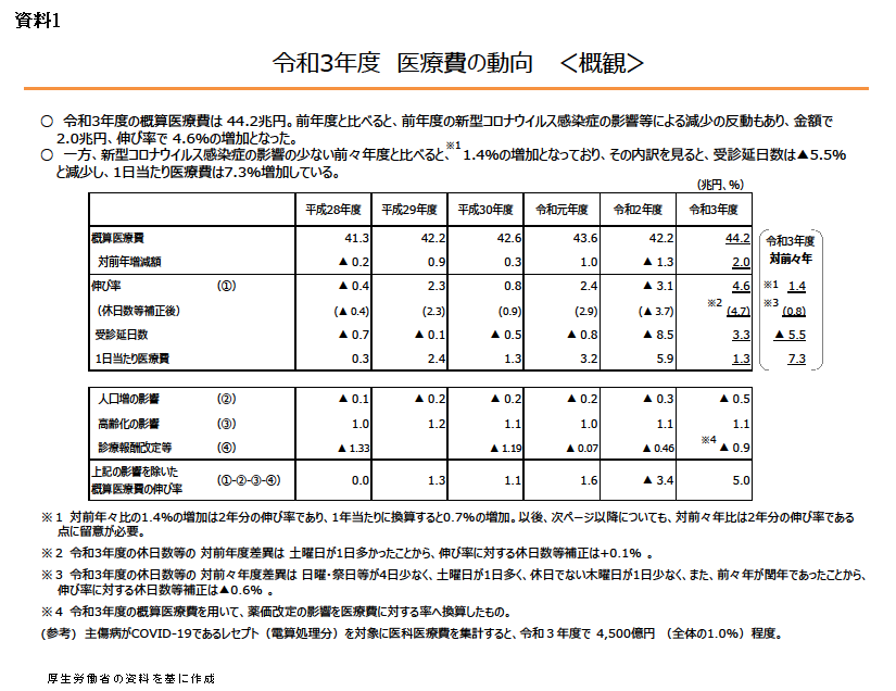 医療費が増加することは医療機関の収入が増加することをも意味するが、国民所得が伸び悩む中で医療費の比率が上昇すれば、それを抑えるためのマイナス改定につながる可能性もある。その後、20年度はコロナ禍で概算医療費は減少したが、21年度はその反動なのか一転して増加している=資料1=。