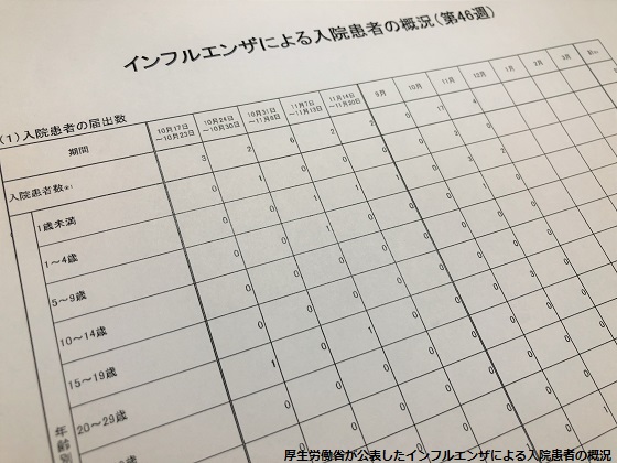 厚生労働省は25日、インフルエンザの入院患者の概況を公表した。14日から20日までの1週間(第46週)の全国の届出数(定点医療機関約500カ所)は、前週と同じ2人だった。新型コロナウイルス感染症が流行する前の2019年同期の約2.1%にすぎない。【新井哉】