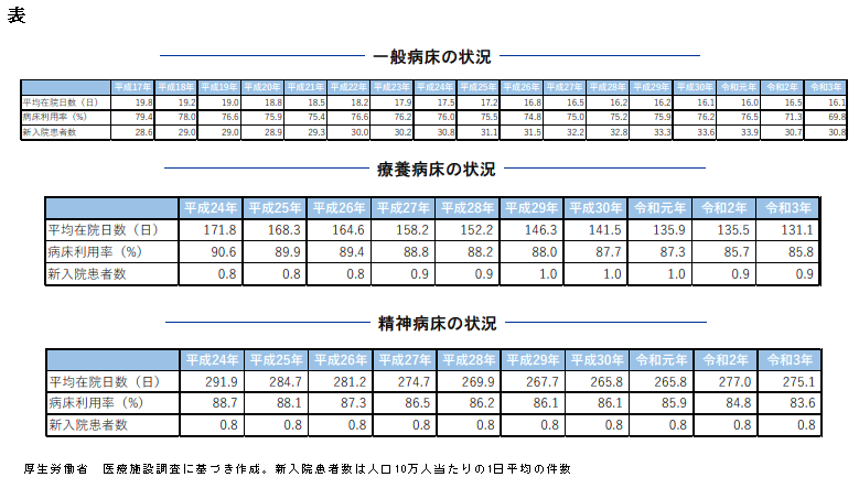 表は病院機能別(一般病床、療養病床、精神病床)に平均在院日数、病床利用率、人口10万人当たり新入院患者数を見たものである。ここから、20年の病床利用率が最悪であり、その後、少し持ち直している傾向が把握できる。ただ、病院機能別で見ると、療養病床や精神病床について、新入院患者数はほぼ横ばいであり、平均在院日数が短縮されたことにより、病床利用率が低めになっていることが分かる。最も減少幅が大きいのが一般病床であり、コロナ禍の影響はあるのだろう。コロナの重点医療機関になった多くが一般病床であるのだから。