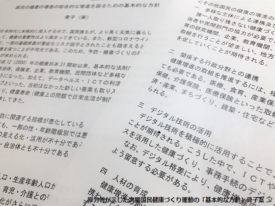 厚生労働省は、26日に開催された専門委員会の会合で、2024年度に開始予定の次期国民健康づくり運動プランの計画期間や取り組みの方向性などを定める「基本的な方針」の骨子案を示した。現行の健康日本21(第二次、13-23年度)の方針で取り上げていない「デジタル技術の活用」を、国民の健康増進の推進の重要事項に追加した。【新井哉】