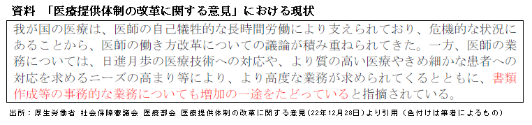 病床の高回転化や診療報酬上の記録などの作業負担増大により、医師事務作業補助者の必要性は年々高まっている。先日、社会保障審議会・医療部会で取りまとめられた医療提供体制の改革に関する意見においても、事務作業の増大に触れられている=資料=。