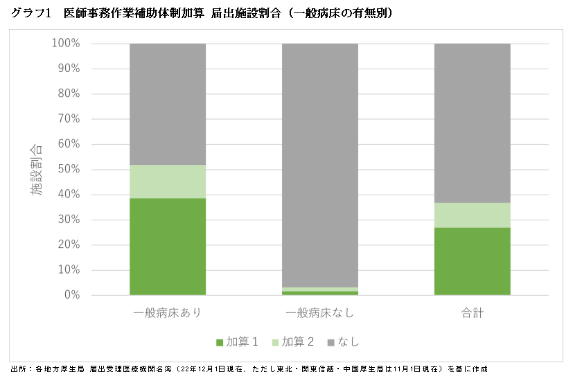 直近の医師事務作業補助体制加算の届出状況を見ると、一般病床を有する病院では、5割以上で届け出ている=グラフ1=。