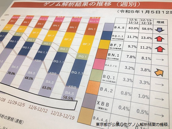 東京都は5日、新型コロナウイルスのゲノム解析結果を公表した。BQ.1.1やBF.7、BN.1などの割合が上昇した。【新井哉】
