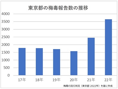 22年の梅毒報告数(速報値)は3,651人で、感染症法に基づく1999年の調査開始以降で最多となっていた21年の報告数を1,200人上回っている。 年齢階級別・性別報告数で見ると、20歳代の女性が940人で最も多く、以下は、30歳代の男...