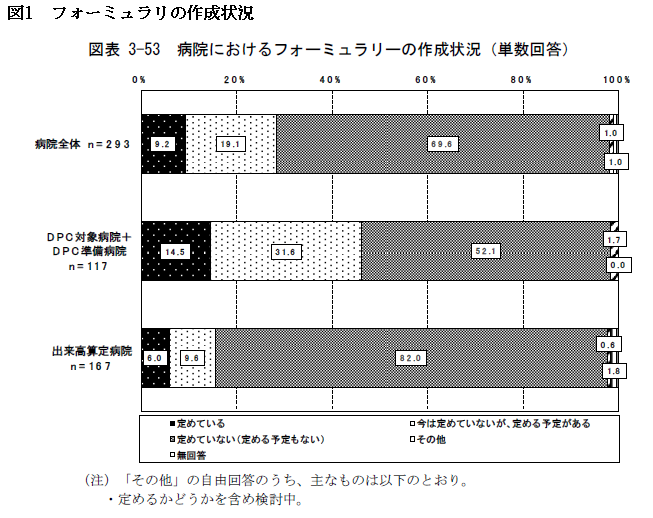 フォーミュラリの導入は、DPC病院を中心にすでに大きく進展しています。点数評価を議論してきた中央社会保険医療協議会は、診療報酬改定結果検証部会による後発医薬品に関する調査の中で、薬局、病院、診療所のそれぞれについて、フォーミュラリへの取り組み状況を調査しています。