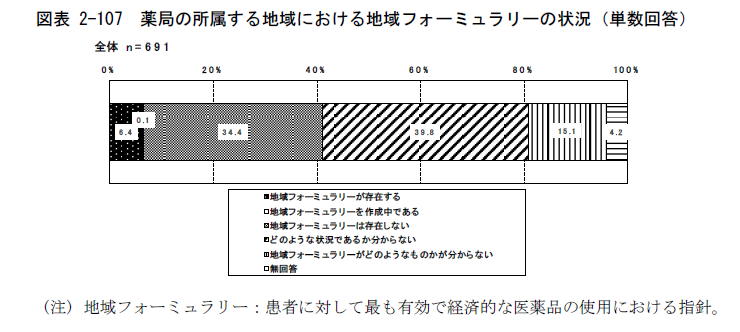 フォーミュラリの策定は進みつつありますが、中医協の調査では、地域フォーミュラリについて、「地域フォーミュラリがどのようなものであるか分からない」との回答が、薬局で15.1%、診療所では39.6%、病院でも6.5%あります。