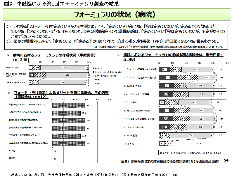 20年度改定後の検証調査で初めて行ったフォーミュラリの導入状況調査の結果、病院の16.1%がフォーミュラリを策定しており、対象薬剤はPPI経口薬が58.1%で最も多かったことなどを示しています。