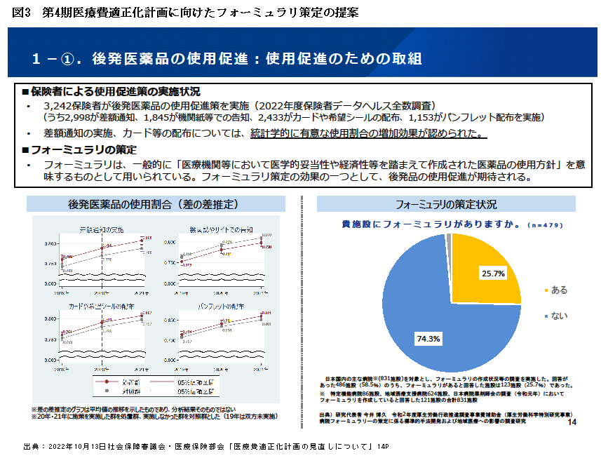 それでも、厚労省は、22年度診療報酬改定後の社会保障審議会・医療保険部会で、骨太方針2022と改革工程表2021により検討が求められていた事項に関する議論の中で、「医療費適正化対策の実効性の確保」の項目の一つ「後発医薬品の使用促進策」として、「フォーミュラリの策定」を改めて提案し、そこに「フォーミュラリ策定の効果の一つとして、後発品の使用促進が期待される」と明記したのです。