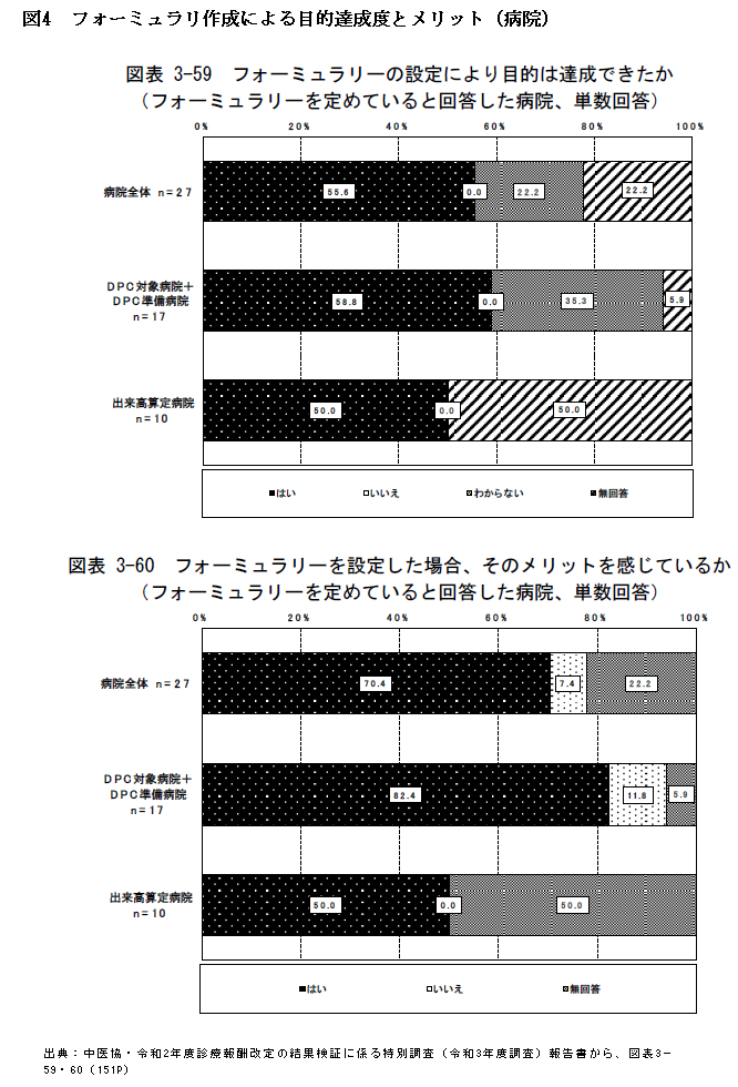 中医協の21年度調査でも、フォーミュラリを策定している病院の目的は、▽有効性、安全性、費用対効果を検討するため▽薬品在庫を減らすため、採用薬品数を減らすため▽エビデンスがあり、コストパフォーマンスに優れる薬剤を推奨することで、費用対効果および支出抑制効果を得るため▽先発品の使用抑制、後発品の適正使用促進-などとされ、有効性と安全性を考慮しながら、後発品の使用促進などによる薬剤費削減が重要な要素となっています。