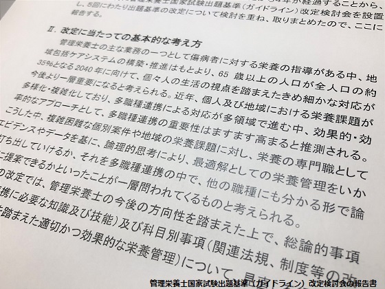 厚生労働省は6日、管理栄養士国家試験出題基準(ガイドライン)改定検討会の報告書案を公表した。栄養管理に関する知識や技能を問う問題については、多職種連携を前提に「栄養専門職としての専門性を的確に問える難易度」とする方向性を示している。【新井哉】