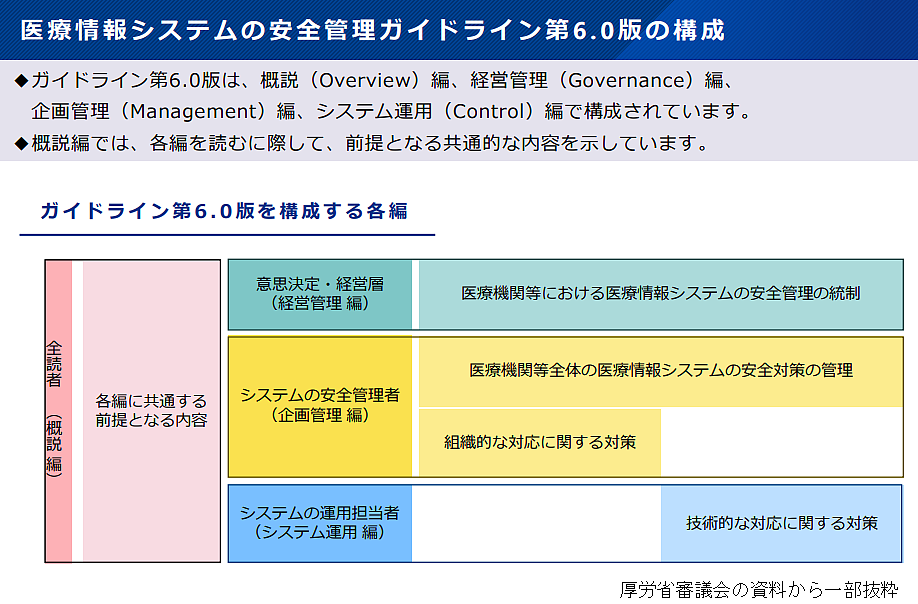 次の第6.0版では、全体の構成を変える。医療機関が対策を講じるに当たっての基本的な知識や各編の概要をまとめた「概説編」をベースに、▽意思決定・経営層を対象にした「経営管理編」▽システムの安全管理者向けの「企画管理編」▽システムの運用担当者向けの「システム運用編」-という構成にする。それぞれの役割に応じて押さえておくべき個所を明確化する。