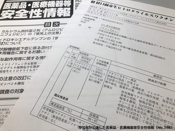 厚生労働省は、医薬品・医療機器等安全性情報(No.398)を公表した。ロタウイルスによる胃腸炎の予防に効能・効果のある経口弱毒生ヒトロタウイルスワクチン「ロタリックス内用液」の副反応(アナフィラキシー反応)に関する経過と処置を取り上げ、医療関係者に注意を促している。【新井哉】