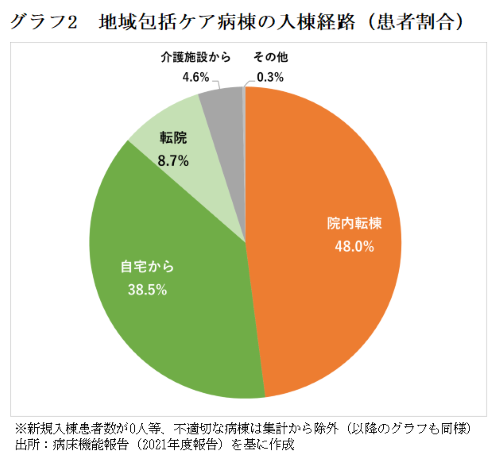 病床機能報告(21年度報告)で地域包括ケア病棟入院料を算定している病棟について入棟経路を見ると、院内転棟が5割弱、自宅からが4割弱となっていた=グラフ2=。