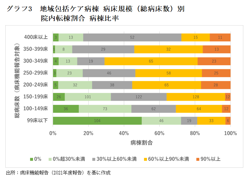 院内転棟の割合について、総病床数(病床機能報告対象の病床。精神病床等は含まない)ごとに比較した=グラフ3=。99床以下は院内転棟割合の低い病棟が多い。ただし99床以下には複数病棟を持たないケースもあり、そもそも転棟がない所も含まれる点は留意すべきである。一方、200床を超えると院内転棟割合が6割を超える所が過半数を占める。ただし400床以上で6割超えは少ない。これは20年度改定の減算規定が少なからず影響しているものと思われる。