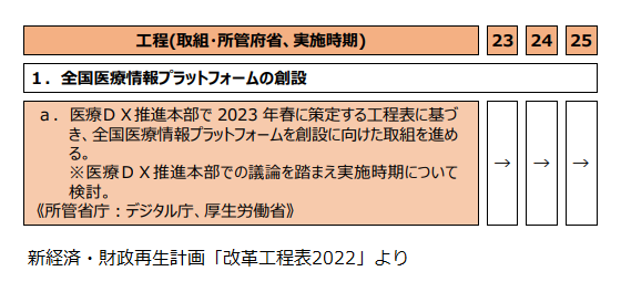 田中参事官 政府の改革工程表2022では、医療DXの3つの柱について、「医療DX推進本部」の議論を踏まえて2023年春に工程表を作成するとされています=図=。