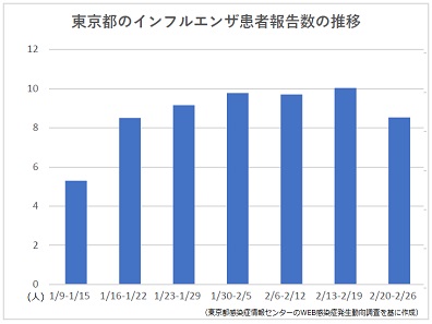 東京でインフル患者減、ピークアウトの兆しも