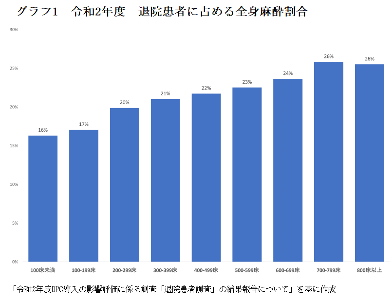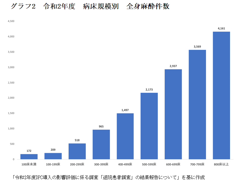 急性期病院にとって全身麻酔は極めて重要であり、高度急性期といいうるためにはその実施率に注目するべきである。グラフ1は、退院患者に占める全身麻酔の割合を病床規模別に見たものであり、大病院ほど全身麻酔の実施率が高い傾向にある。中小病院は心不全や誤嚥性肺炎などの高齢者に対する救急搬送が多いことなどが関係しているのだろう。