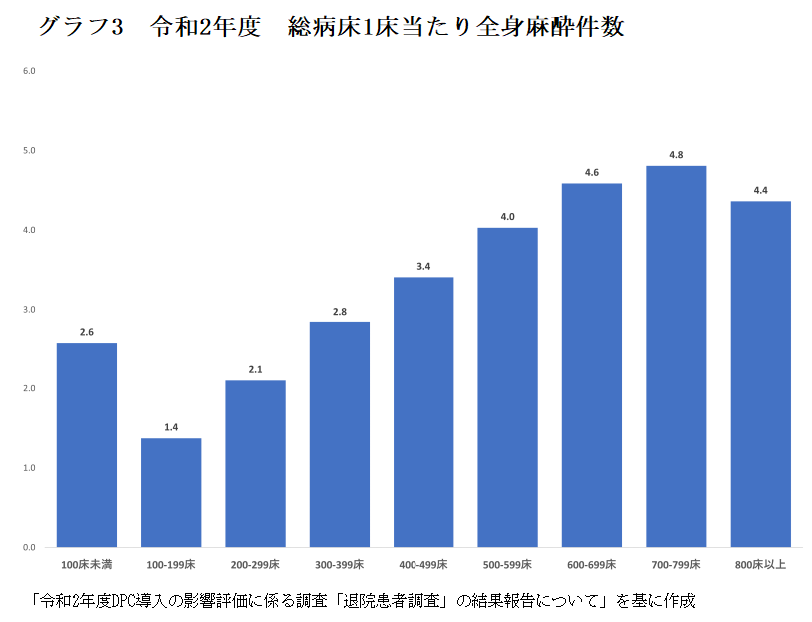 連載第166回では19年度のデータを用いて病床規模別の全身麻酔件数を見たが、本稿ではコロナ禍で最も厳しかったタイミングである20年度データに差し替えたものの、傾向は変わらず大病院ほど件数が多い=グラフ2=。ただ、これは病床数が多いのだから当然であり、総病床1床当たりの全身麻酔件数にしてもやはり大病院の実績が優れる。ただし、100床未満および800床以上については、傾向が異なり、何らかの専門病院の実績が影響していることに加え、800床以上では内科系の難治疾患患者が多く、病床数が多すぎることが関係しているのだろう=グラフ3=。