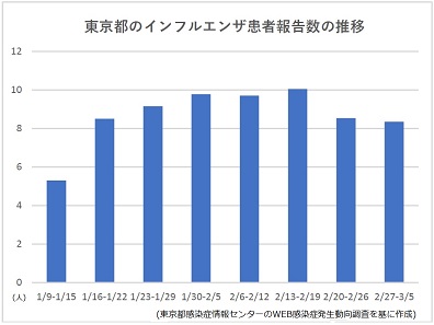 東京都のインフルエンザ患者報告数が2週連続減少