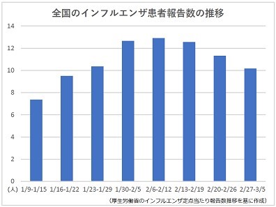 2月27日から3月5日までの1週間(第9週)の全国の定点医療機関当たりの患者報告数は前週比約10.2%減の10.17人で、30都道府県で前週よりも減った。 都道府県別では、石川が33.77人で最も多く、以下は、岩手(33.37人)、富山(26...